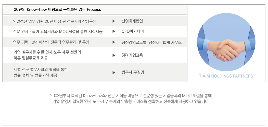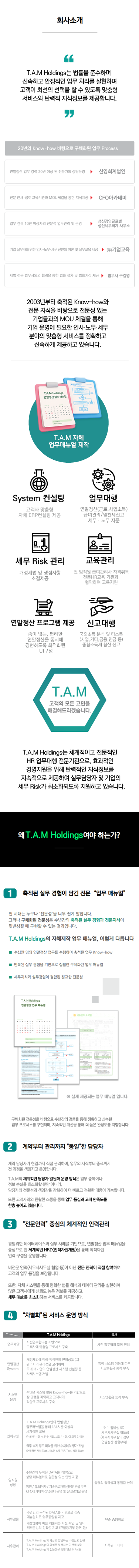 사후관리 | T.A.M Holdings의 과실로 발생하는 수정신고 진행 T.A.M Holdings의 과실로 발생하는 가산세 부담 T.A.M Holdings의 전문성을 통한 연중 HR상담 | 사후관리 미비 |