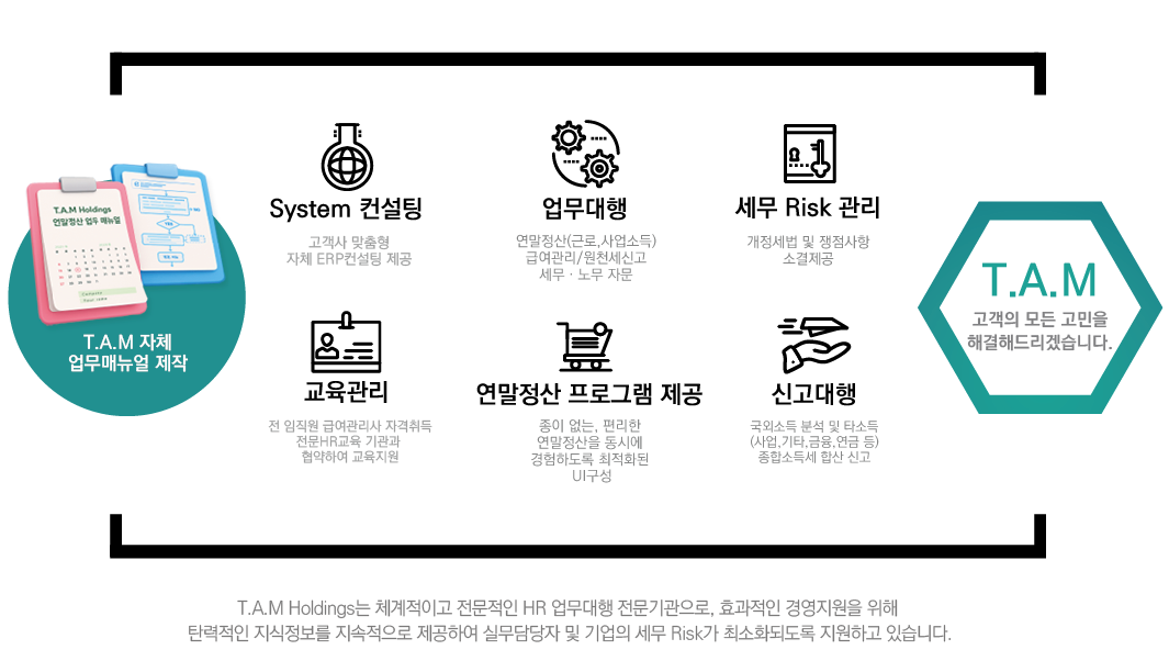 인력구성 | T.A.M Holdings만의 연말정산 업무매뉴얼을 통해 134시간 이상의 체계적인 교육 (이론: 64시간, 실무: 64시간, 보안: 4시간, CS교육: 2시간) 업무 숙지 정도 파악을 위한 수차례의 평가 진행 (연말정산 세법 Test, 시스템 실무 적용 Test, 상담 Test) | 단순 알바생 또는 세무사사무실 하도급 (세무사사무실의 경우 연말정산 경험부족) |