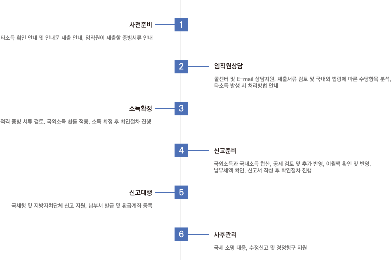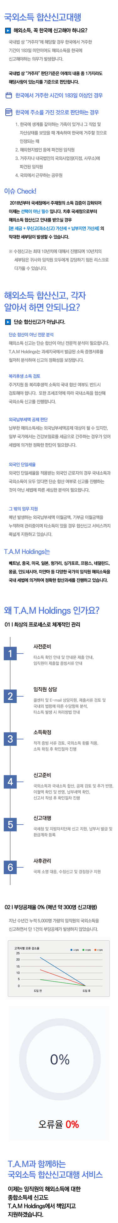 단순 합산이 아닌 전문 분석 해외소득 신고는 단순 합산이 아닌 전문적 분석이 필요합니다.T.A.M Holdings는 과세지국에서 발급된 소득 증명서류를 철저히 분석하여 신고의 정확성을 보장합니다. | 복리후생 소득 검토 주거지원 등 복리후생적 소득의 국내 합산 여부도 반드시 검토해야 합니다. 또한 조세조약에 따라 국내소득을 합산해 국외소득 신고를 진행합니다. | |