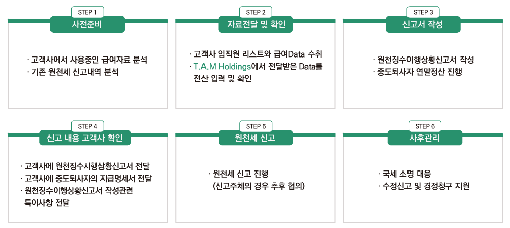 저희 T.A.M Holdings는 인사담당자분들의 원천세 신고를 지원하여 업무 부담을 줄여드립니다.
