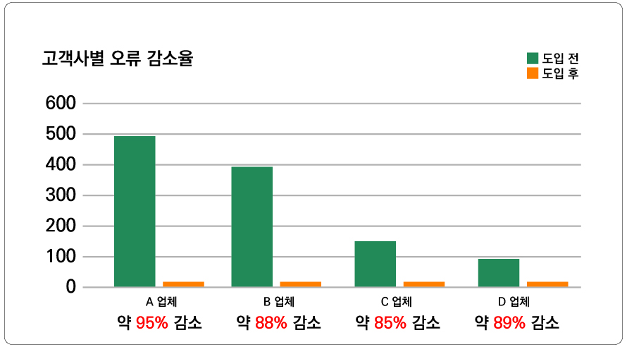 PAYTAX 도입 후 오류율 85~95% 감소 PAYTAX 도입 후 오류율이 85~95% 감소했습니다. 이는 업무 효율성 향상과 직원 만족도 증가로 이어집니다. | |||